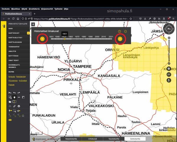 kuva3 - Historiallisia ilmakuvia selataan kuvassa ympyröidyillä valintanuolilla. Valittu vuoden 1951 kartta-aineisto. Tässä näkymässä sitä on esim Länkipohjan yllä. Lyötyneet kartta-aineistot ovat siis keltaisella pohjalla. Voit suurentaa karttaa, jolloin karttanäkymä näyttää kaiken aineiston vuodelta 1951. Tässä ohjeessa pysyn tuossa näkymässä. Suurenna karttaa kohdassa Länkipohja.
