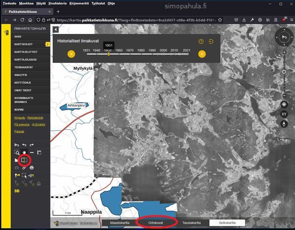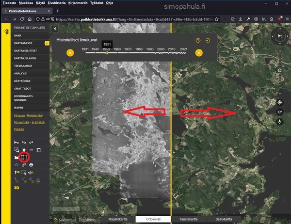 kuva4 - Historiallinen ilmakuva näkyy. Rajana on selkokartta (taustakartta, ilmakuva on sen päällä oleva taso) Valitse Ortokuva (kaikkein uusin ilmakuva). Työkaluista on ympyröity valinta, jolla voit vertailla kuvia.